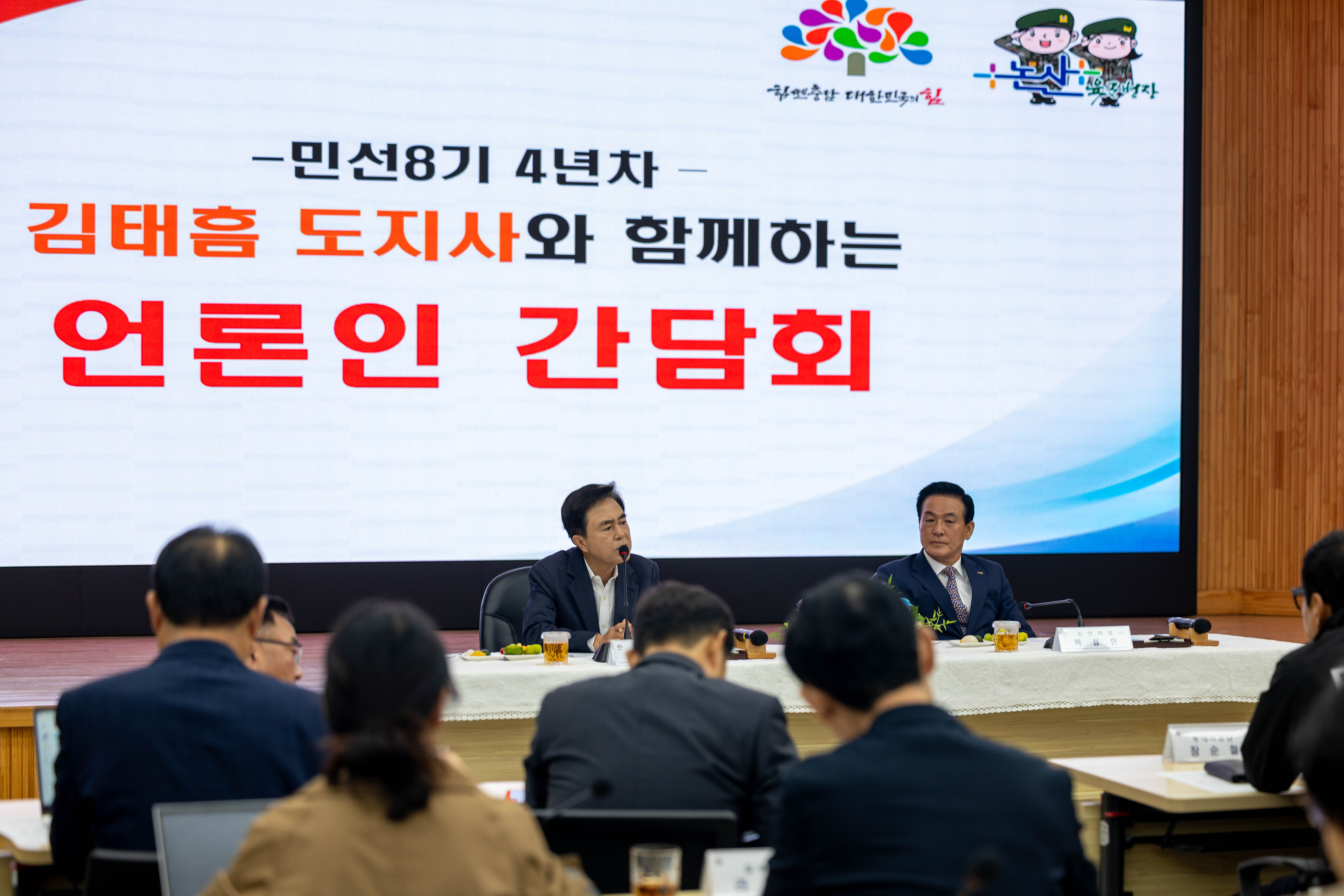 김태흠 충남지사는 16일 민선8기 4년 차 시군 방문의 아홉 번째 일정으로 논산시를 찾아, 언론인 간담회와 도민과의 대화를 통해 지속 가능한 발전 방향을 모색하고 현장을 직접 점검했다.