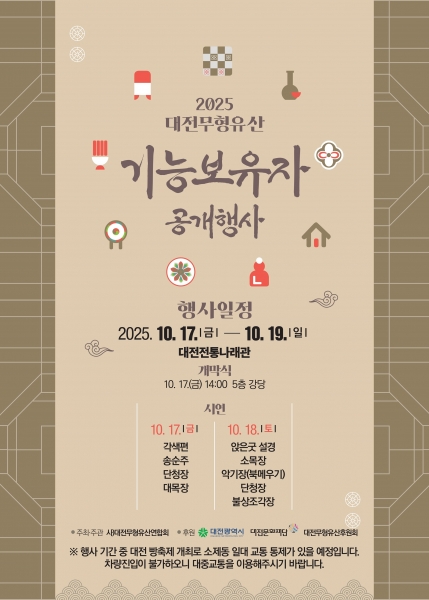[세종타임즈] 대전시는 17일부터 19일까지 사흘 동안 대전전통나래관에서 ‘2025년 무형유산 기능보유자 합동공개행사’를 개최한다.