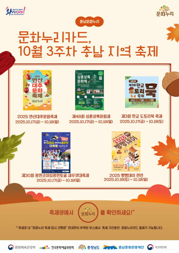 10월 3주차 문화누리카드 사용이 가능한 충남 지역 축제로는 △ 광천조미김·광천토굴새우젓 대축제 △ 빵빵데이 천안 △ 판교도토리묵축제 △ 연산대추문화축제 △ 심훈상록문화제 등이 있다.