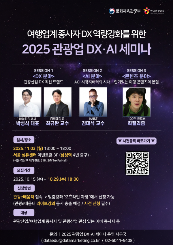 공사 양경수 관광산업실장은 “이번 세미나를 통해 업계 종사자들이 현장에서 적용할 수 있는 실질적인 인사이트를 얻기를 기대한다”며 “공사는 앞으로도 업계 트렌드를 반영한 교육으로 종사자 역량 강화에 힘쓸 것”이라고 밝혔다.
