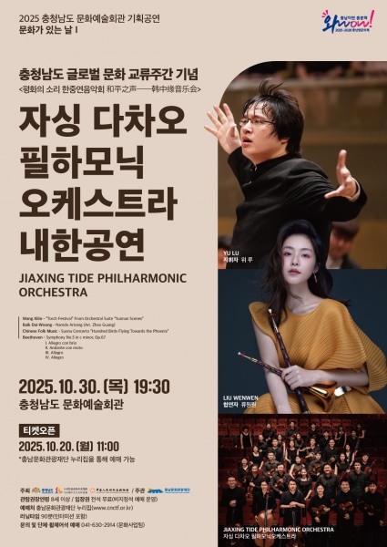 [세종타임즈] 충남문화관광재단은 오는 10월 30일 19시 30분, 충청남도 문화예술회관에서 충청남도 글로벌 문화 교류주간 기념 ‘자싱 다차오 필하모닉 오케스트라 내한공연’을 전석 무료 진행한다.