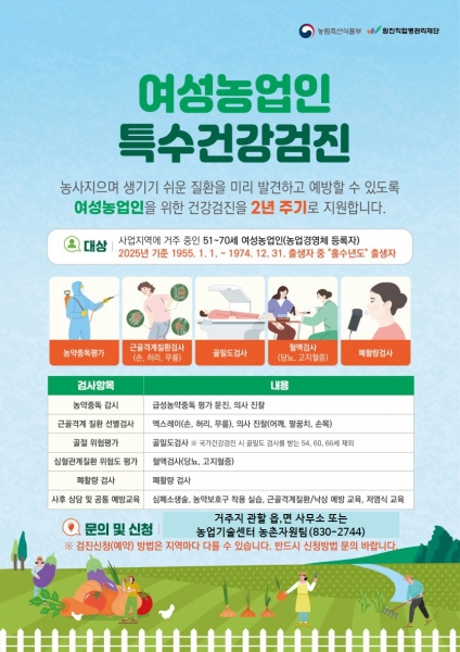 송인헌 군수는 “이번 특수건강검진을 통해 여성농업인들이 농작업 질환을 조기에 예방하고 건강한 농촌생활을 이어갈 수 있기를 바란다”며 “신속하고 체계적인 검진이 이뤄질 수 있도록 행정적 지원에 최선을 다하겠다”고 밝혔다.