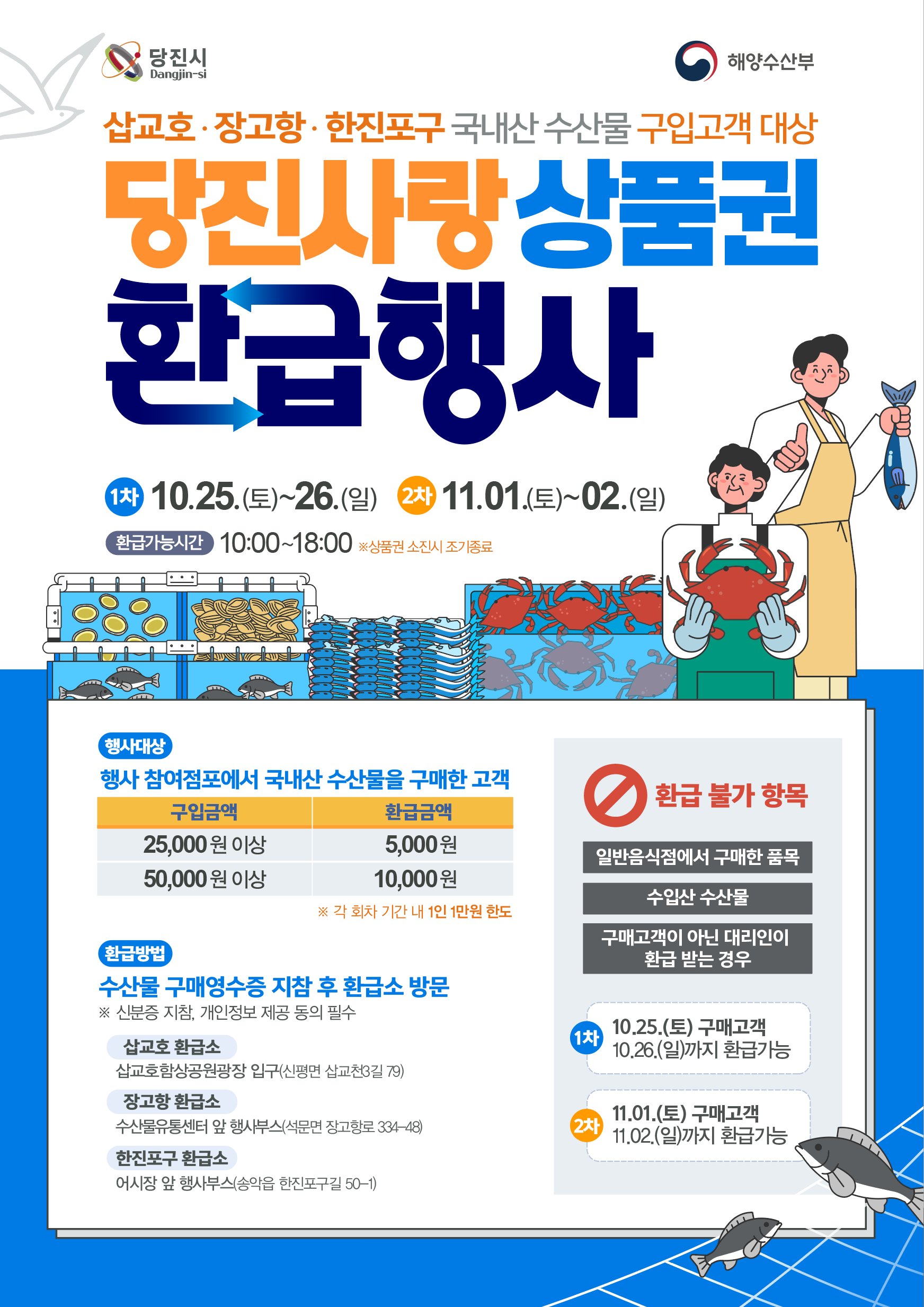 소비자는 삽교호 수산물판매점, 장고항 수산물유통센터, 한진포구 어시장 내 환급행사 참여 점포에서 국내산 수산물을 구매한 뒤, 영수증과 신분증을 지참해 지정된 환급소를 방문하면 된다.