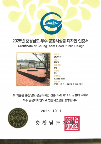 [세종타임즈] 천안시는 ‘2025 제16회 충청남도 우수공공시설물 디자인 인증제’에서 평상 디자인으로 공공기관 최초 인증을 받았다고 22일 밝혔다.