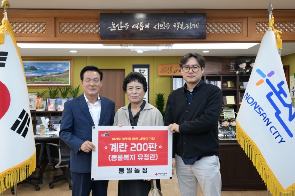 기탁식에 참여한 백성현 논산시장은 “전해주신 유정란은 이웃들에게 큰 힘이 될 것”이라며 “작은 나눔이 모여 큰 사랑을 실천할 수 있음을 보여주신 동일농장에 깊이 감사드린다”고 전했다.