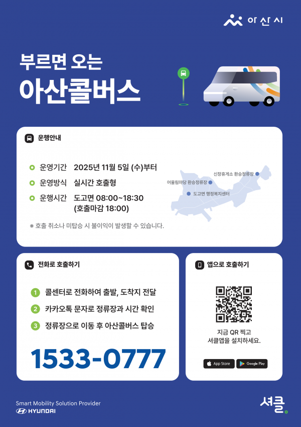 [세종타임즈] 아산시가 도고면 지역의 관광 활성화와 주민들의 이동 편의성 제고를 위해 오는 11월 5일부터 수요응답형 공공형 버스 ‘아산콜버스’를 시범 운행한다.
