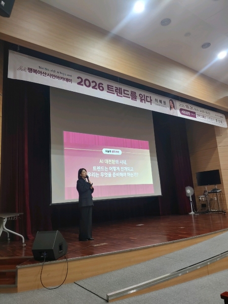 [세종타임즈] 아산시는 21일 배방읍 행정복지센터 다목적홀에서 ‘행복아산 시민아카데미’ 다섯 번째 강연으로 이혜원 교수의 ‘2026 트렌드를 읽다’ 특강을 개최했다고 밝혔다.
