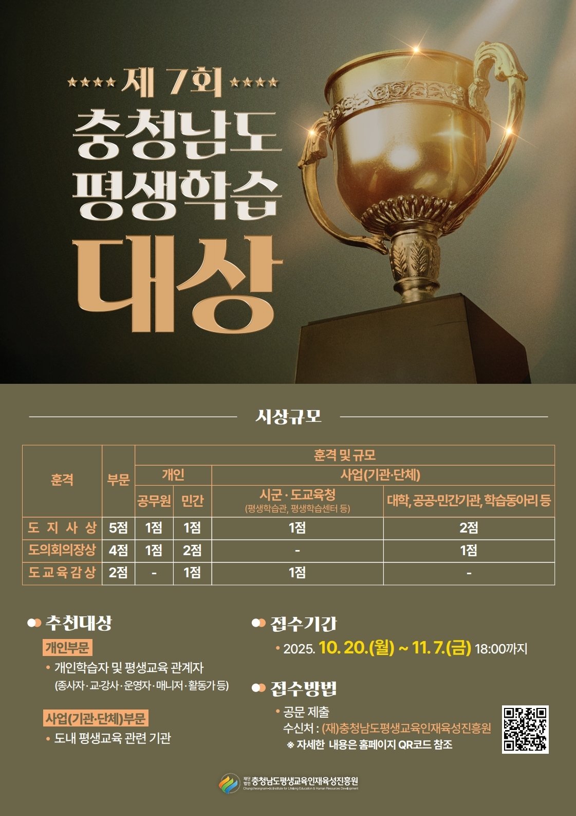 [세종타임즈] 충남평생교육인재육성진흥원(원장 황환택)은‘2025년 제7회 충남 평생학습대상’표창 공모를 실시한다고 23일 밝혔다.