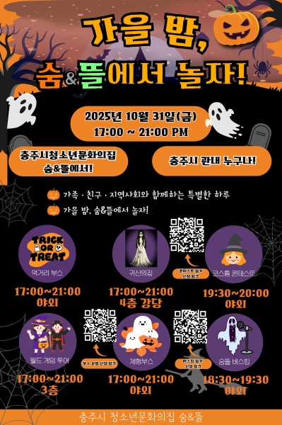 [세종타임즈] 충주시청소년문화의집 숨&뜰에서는 10월 31일 오후 5시부터 9시까지 ‘가을밤, 숨뜰에서 놀자’ 행사를 진행한다고 밝혔다.