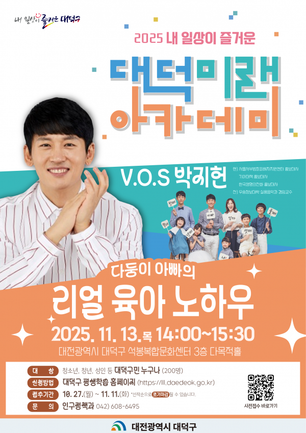 최충규 대덕구청장은 “진솔한 육아 이야기를 통해 구민들이 공감과 위로를 얻길 바란다”며 “앞으로도 다양한 주제의 강연으로 삶의 질을 높이는 배움의 기회를 계속 마련하겠다”고 말했다.