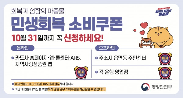 [세종타임즈] 행정안전부는 2차 민생회복 소비쿠폰의 온라인·오프라인 신청이 오는 10월 31일에 마감된다고 안내했다.