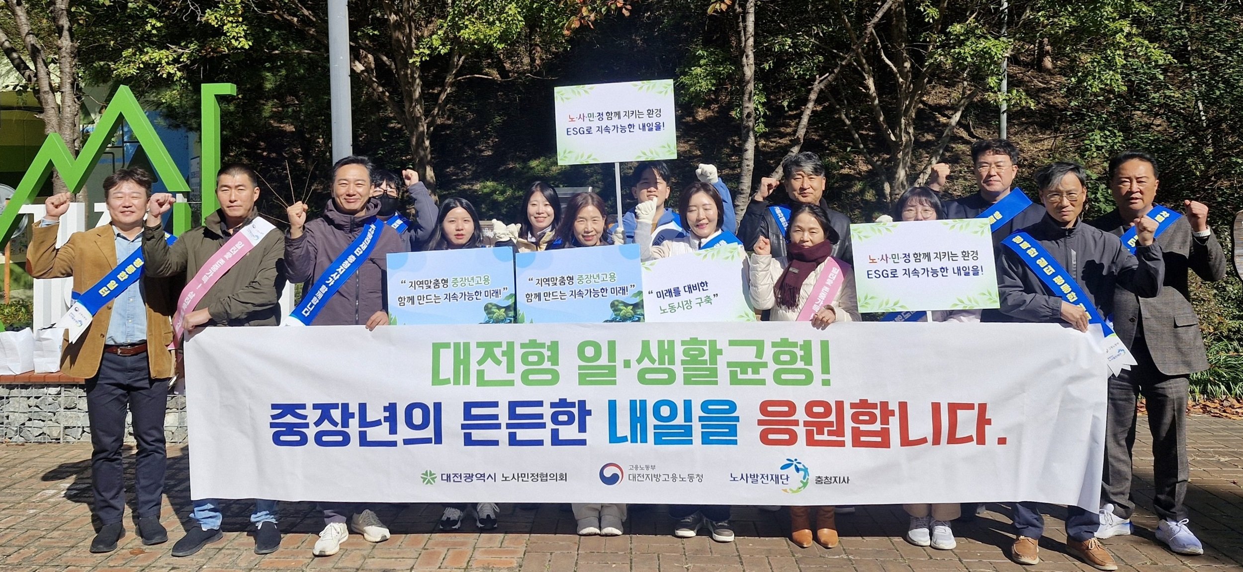 이번 캠페인은 대전광역시 노사민정협의회, 대전지방고용노동청, 노사발전재단 충청지사가 공동으로 추진한 협력형 환경·사회 가치(ESG) 실천 활동으로 지역 중장년층의 고용안정과 건강한 일터문화 조성을 목표로 진행됐다.