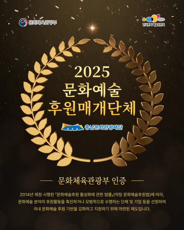 [세종타임즈] 충남문화관광재단이 문화체육관광부가 주관하고 한국문화예술위원회가 운영하는 ‘2025년도 문화예술후원매개단체 인증제도’에서 신규 인증기관으로 선정됐다.