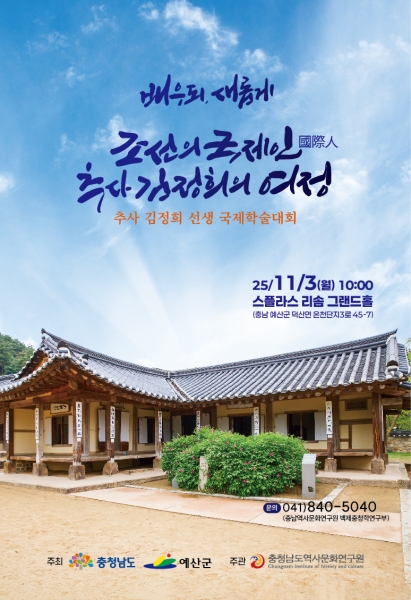 [세종타임즈] 충남역사문화연구원이 주관하고 충청남도와 예산군이 공동으로 주최하는 추사 김정희 선생 국제학술대회가 오는 2025년 11월 3일 10시 스플라스 리솜 그랜드홀에서 개최된다.