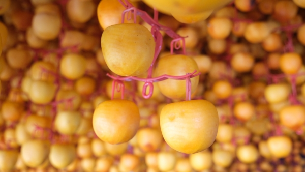 감은 깨끗하고 안전한 위생처리시설을 갖춘 감타래에서 약 45일간 자연 건조를 거쳐 황금빛 곶감으로 변신한다.