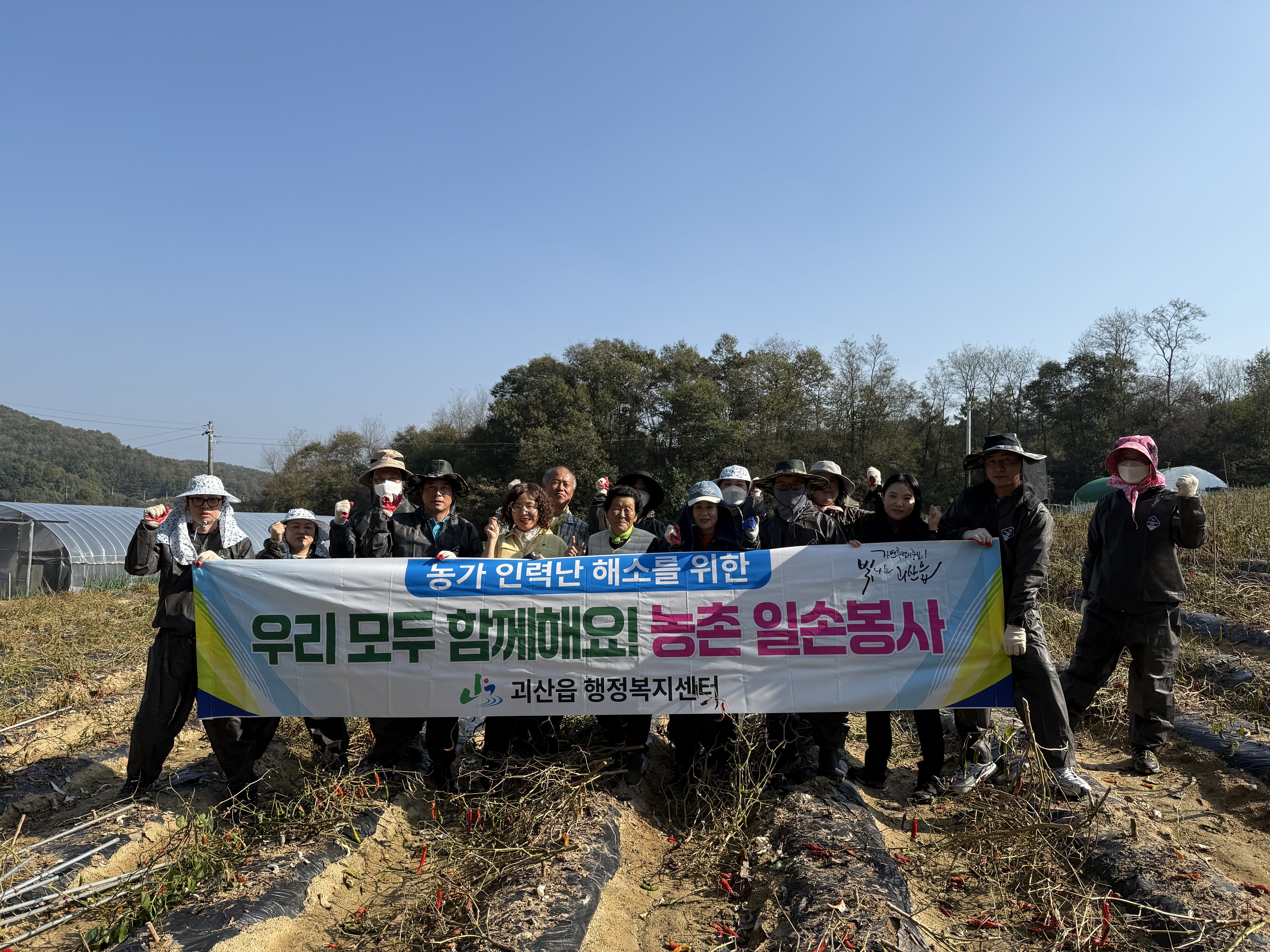 이날 괴산읍 직원 17명은 오길표 농가를 방문해 고추 말뚝 뽑기와 비닐 제거 등 수확 후 작업을 도우며 부족한 일손을 보탰다.