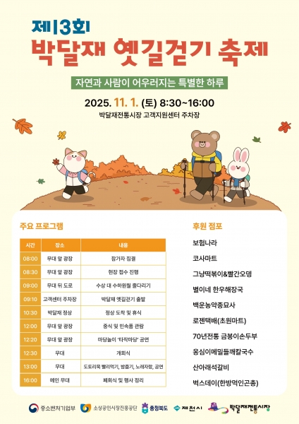 [세종타임즈] 제13회 박달재 옛길걷기 행사가 오는 11월 1일 박달재전통시장 일원에서 개최된다.