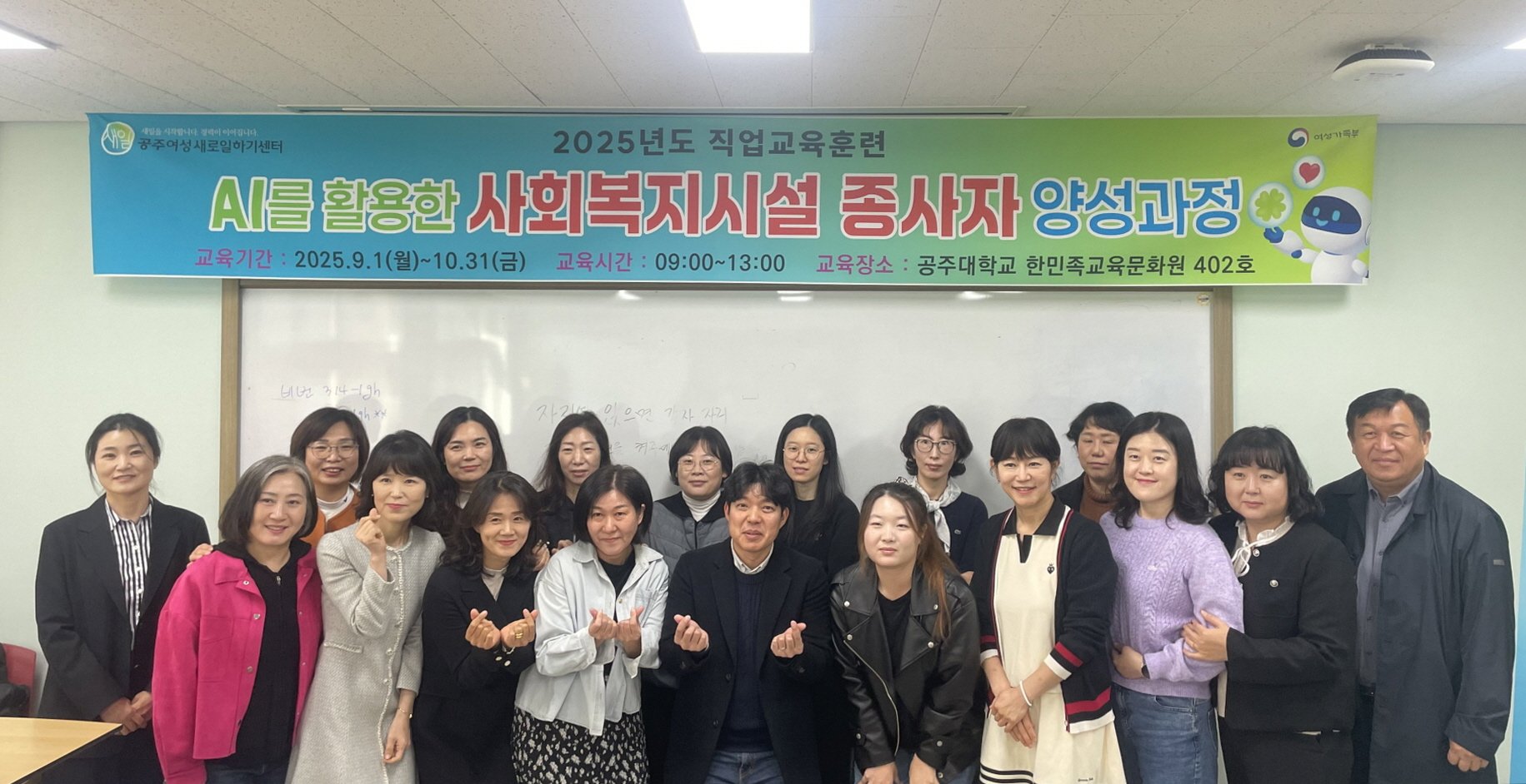 [세종타임즈] 공주여성새로일하기센터는 지난 31일 국립공주대학교 옥룡캠퍼스 평생교육원에서 국비지원 직업교육훈련 ‘인공지능(AI)을 활용한 사회복지시설 종사자 양성과정’을 성공적으로 마무리했다고 밝혔다.