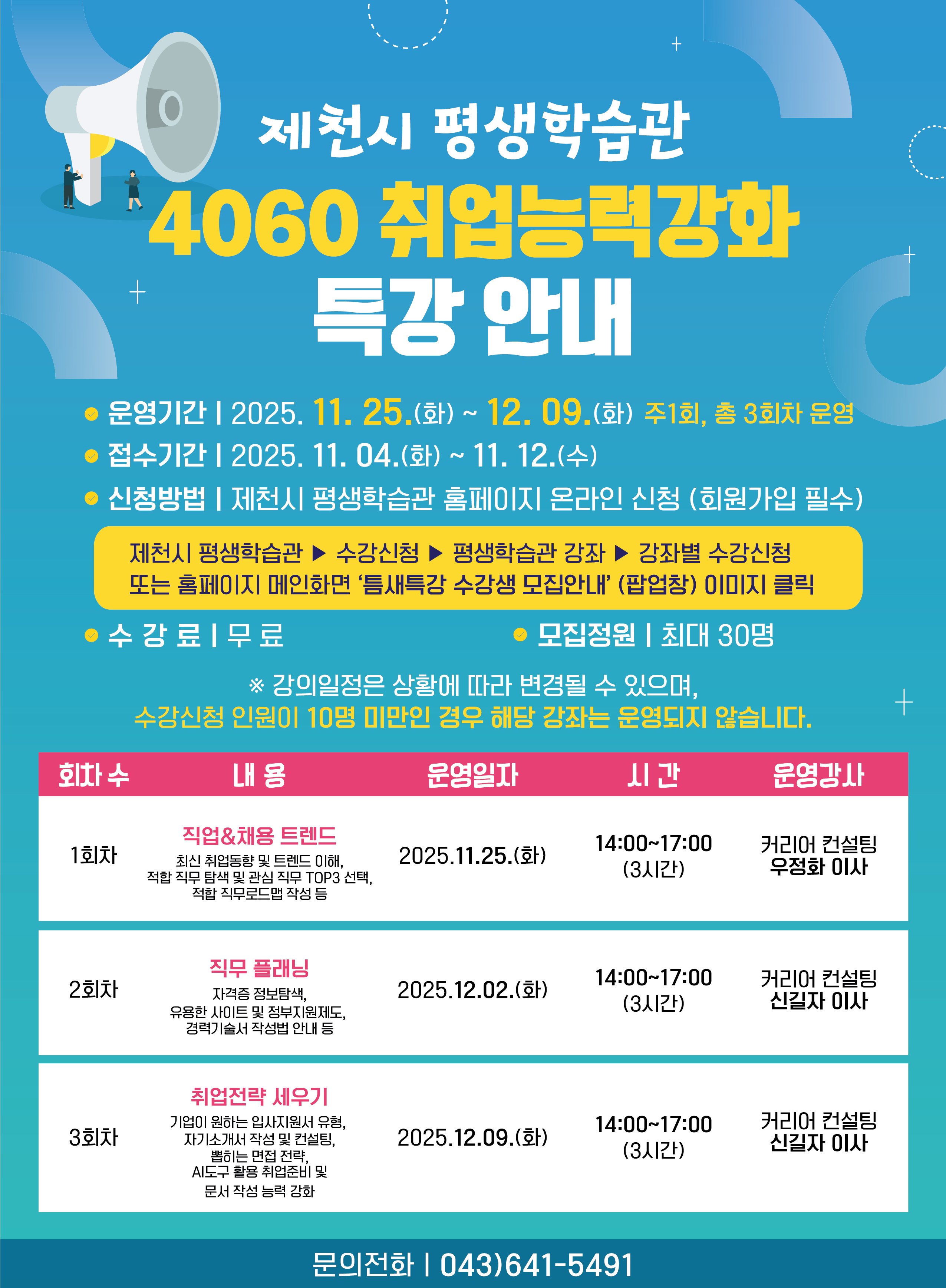 이번 틈새특강은 일반시민과 40대 이상 취업·재취업 준비자, 평생학습강사를 대상으로 진행되며 세명대학교와 대원대학교 교수진 및 컨설팅 전문가들이 참여한다.