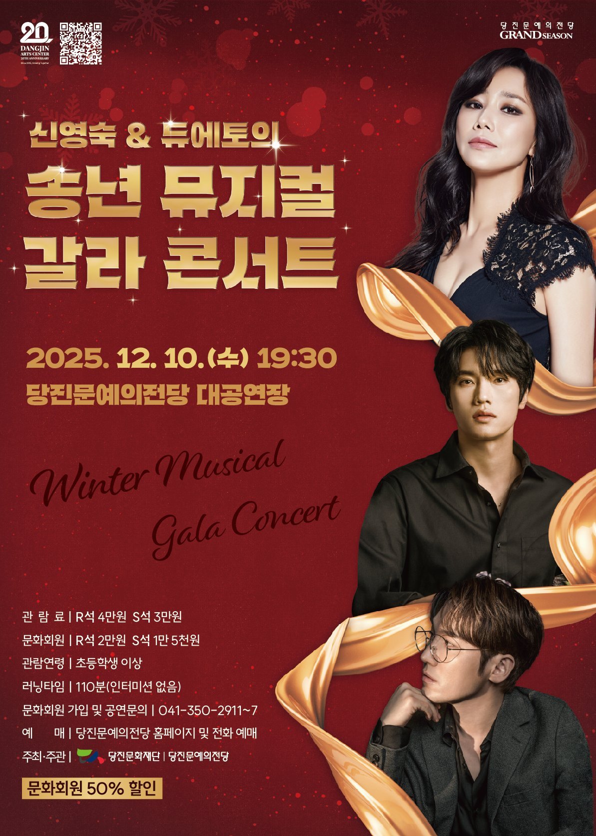 [세종타임즈] 당진문화재단·당진문예의전당은 당진문예의전당 개관 20주년을 기념해 특별 기획공연 ‘신영숙 & 듀에토의 송년 뮤지컬 갈라 콘서트’를 오는 12월 10일 오후 7시 30분, 당진문예의전당 대공연장에서 선보인다.