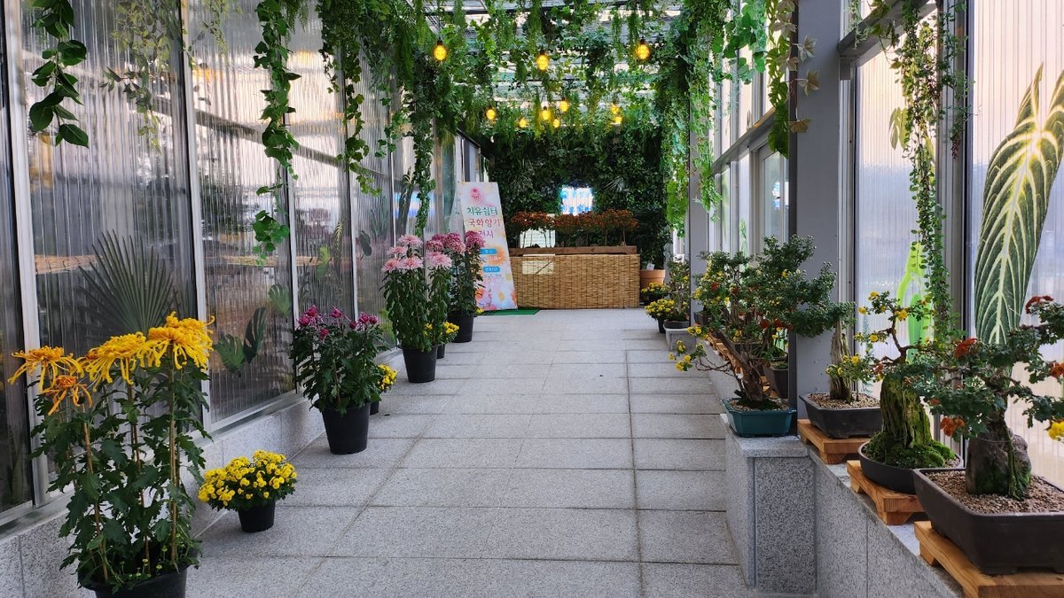 야외쉼터 공간에는 억새풀 50여 점과 국화 조형작들로 조성된 포토존까지 마련되어 있어 국화 활용도를 높였다.
