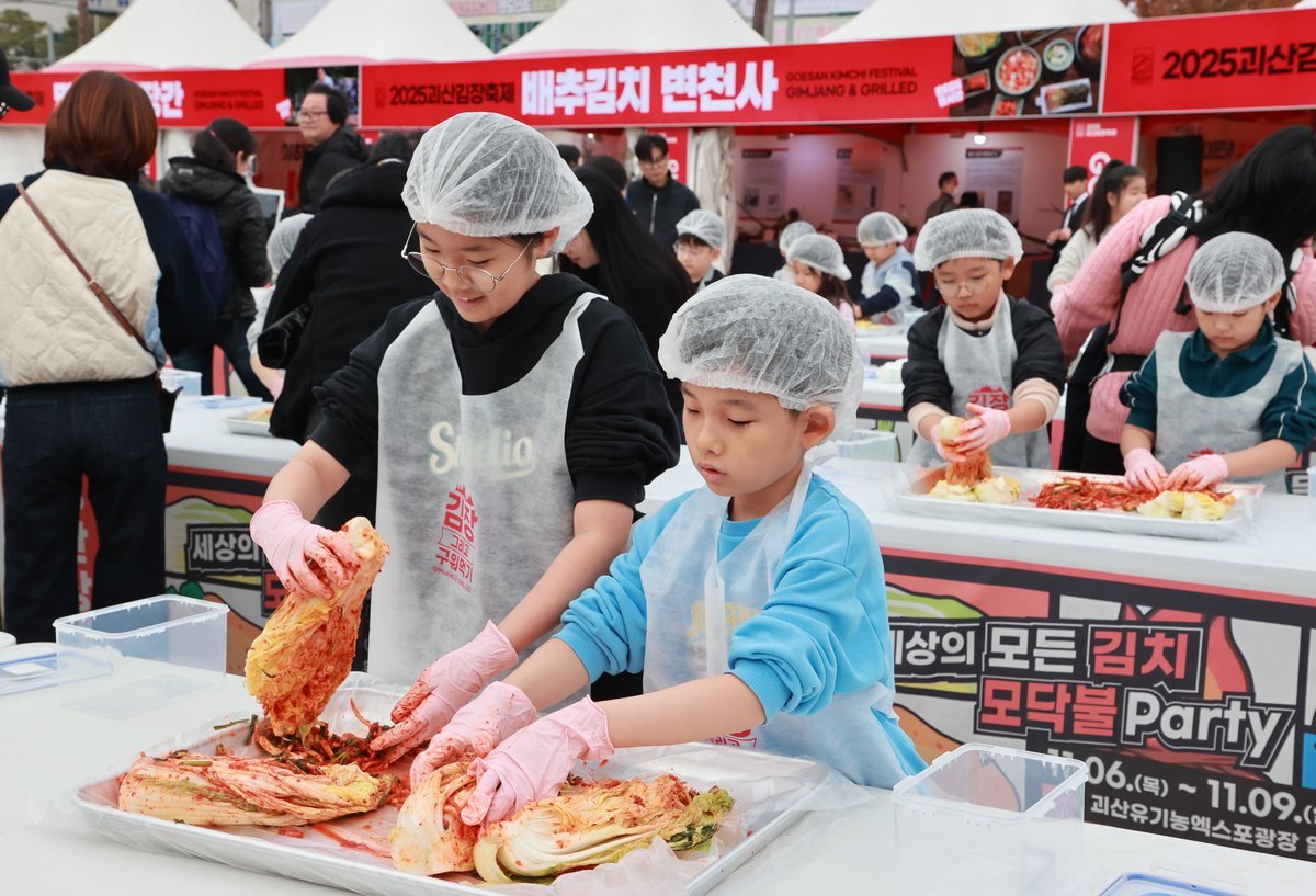 [세종타임즈] 충북 괴산군 유기농엑스포 광장에서 열리고 있는 ‘2025 괴산김장축제’에서 8일 어린이 김장체험이 열려 눈길을 끈다.