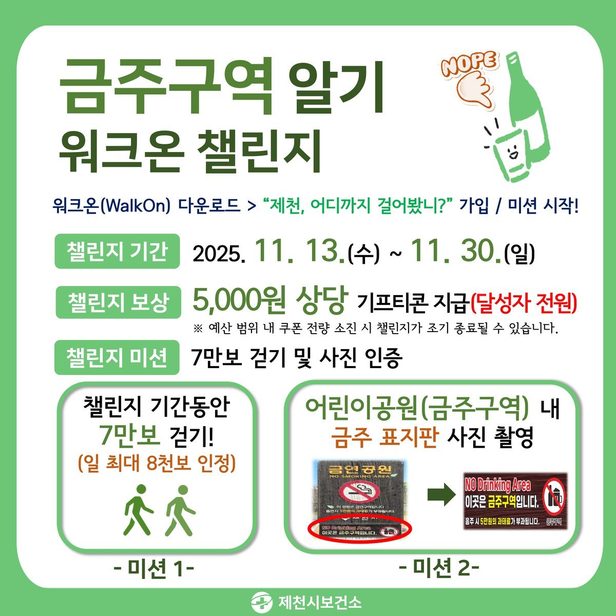 이번 챌린지는 걷기 활성화와 금주구역 홍보를 목적으로 하며‘워크온 앱’을 통해 제천시민이라면 누구나 참여할 수 있다.