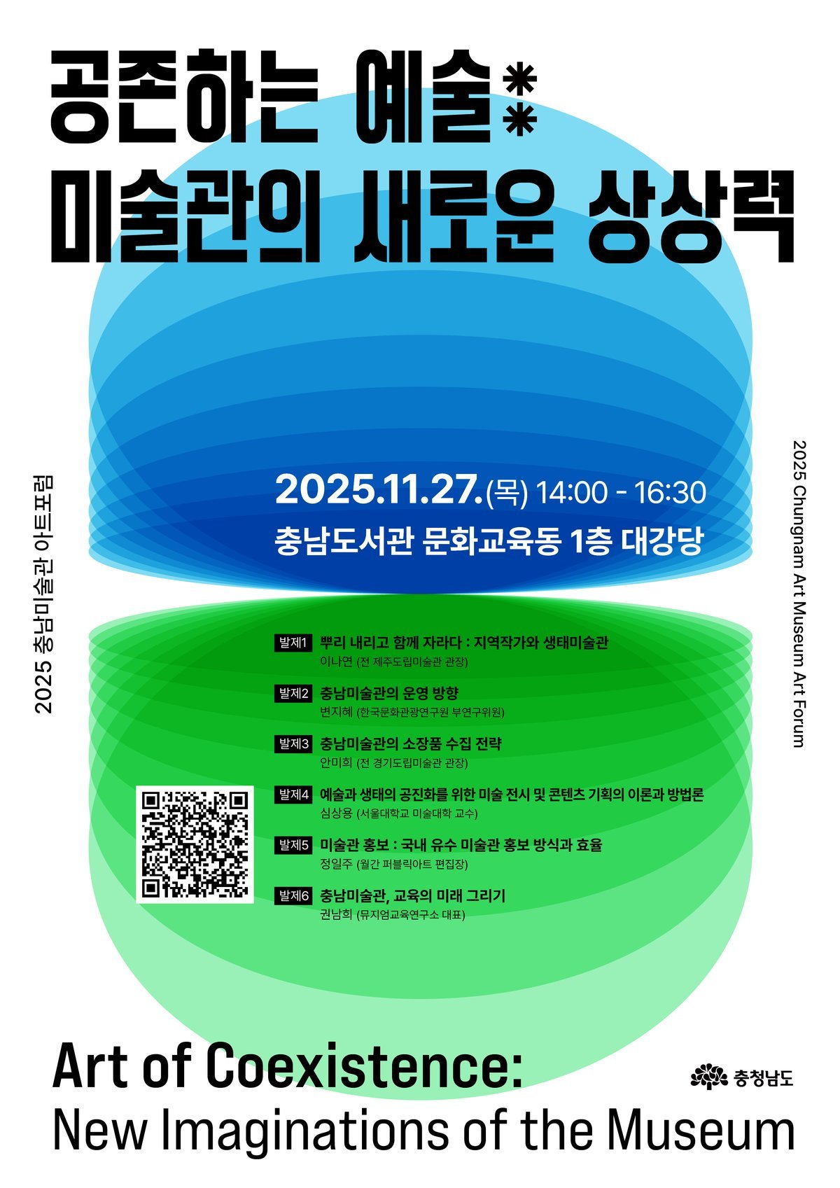 도 관계자는 “충남미술관은 단순한 전시 공간을 넘어 지역 문화예술의 활성화와 문화적 가치 창출에 중요한 역할을 할 것”이라며 “이번 아트포럼을 통해 충남미술관의 미래 방향을 함께 모색할 수 있도록 많은 관심과 참여를 부탁드린다”고 말했다.
