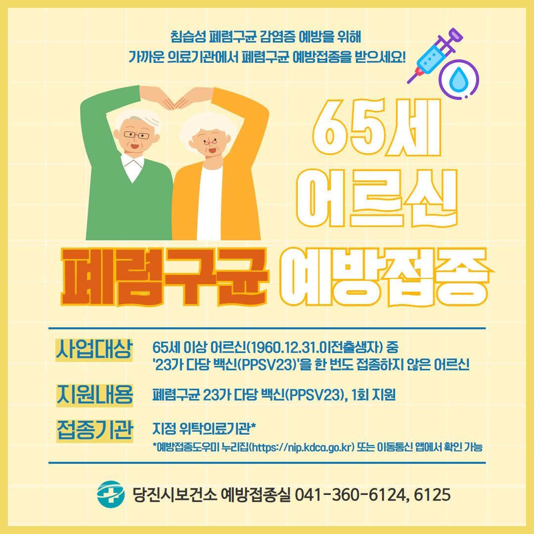 [세종타임즈] 당진시보건소는 침습성 폐렴구균 감염증을 예방하기 위해 65세 이상 어르신을 대상으로 폐렴구균 백신을 무료 접종한다고 19일 밝혔다.