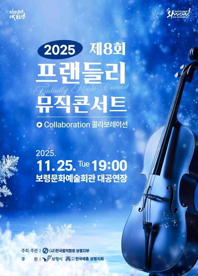 [세종타임즈] 한국예총 보령지회 음악지부가 주관하는 ‘제8회 프렌들리 음악회’가 오는 11월 25일 오후 7시 보령문화예술회관 대공연장에서 개최되어 보령시민들에게 특별한 문화향유의 기회를 제공한다.