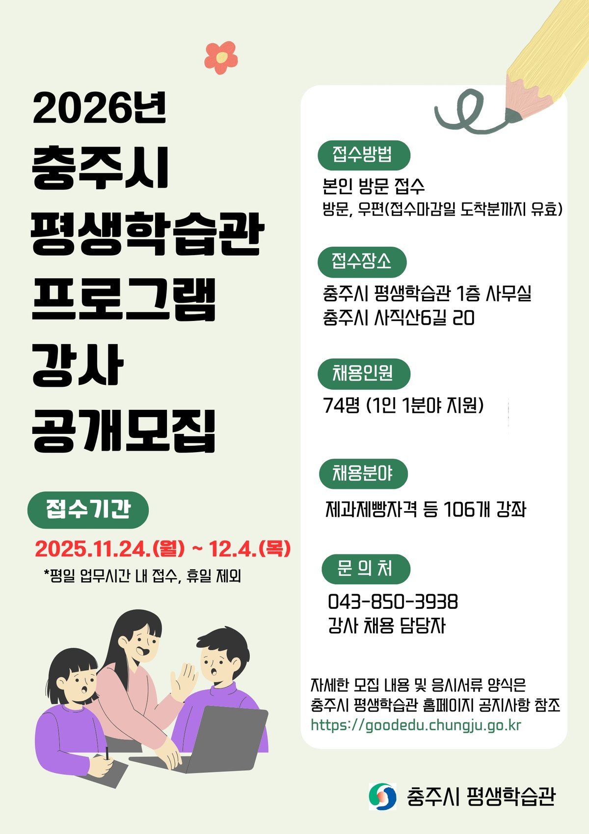강사 모집과 관련한 자세한 사항은 충주시 평생학습과로 문의하면 된다.