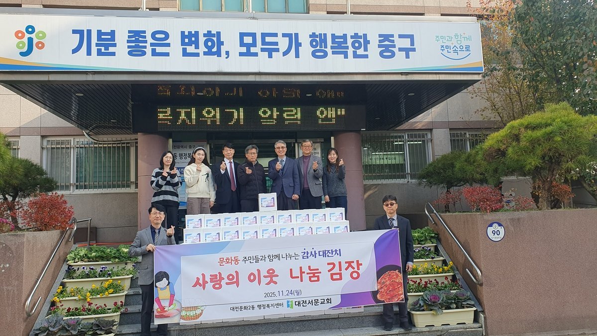 [세종타임즈] 대전 중구 문화2동 행정복지센터는 24일 대전서문교회에서 지역 내 어려운 이웃을 돕기 위해 김장김치 100박스를 기탁했다고 밝혔다.