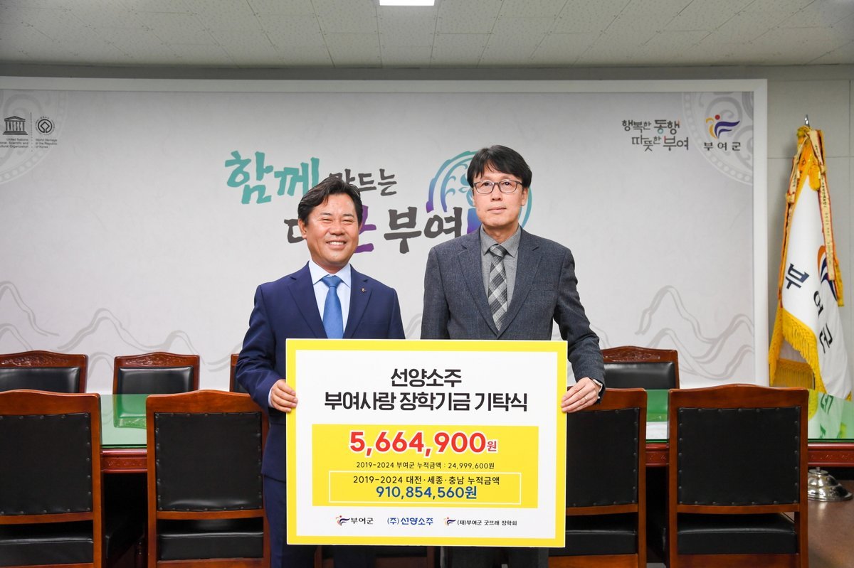 [세종타임즈] ㈜선양소주는 지난 26일 부여군청을 방문하여 인재 육성을 위한 장학금 566여만 원을 부여군굿뜨래장학회에 기탁했다.