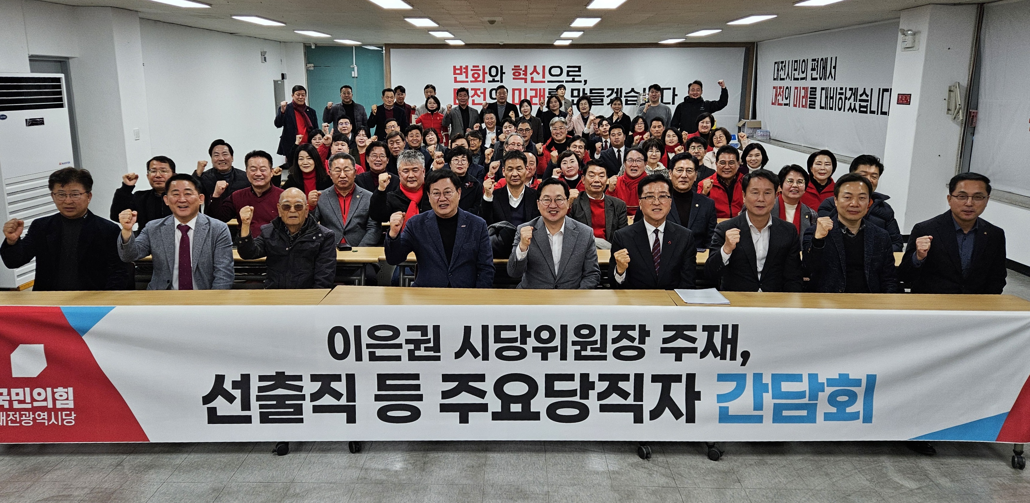 이날 간담회에는 이은권 시당위원장, 이장우 대전시장, 박경호 대덕구 당협위원장, 이상래·이택구 조직위원장, 박희조·서철모·최충규 구청장, 조원휘 대전시의회 의장을 비롯한 시·구의원, 상설특별위원장 등 100여 명이 참석했다.