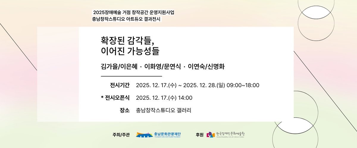 [세종타임즈] 충남문화관광재단은 「2025 장애예술 거점 창작공간 운영 지원사업」의 성과 확산과 장애예술 인식 제고를 위해 2025년 12월 17일부터 28일까지 충남 태안군 충남창작스튜디오 갤러리에서 「확장된 감각들, 이어진 가능성들」 아트듀오 결과전시회를 개최한다.