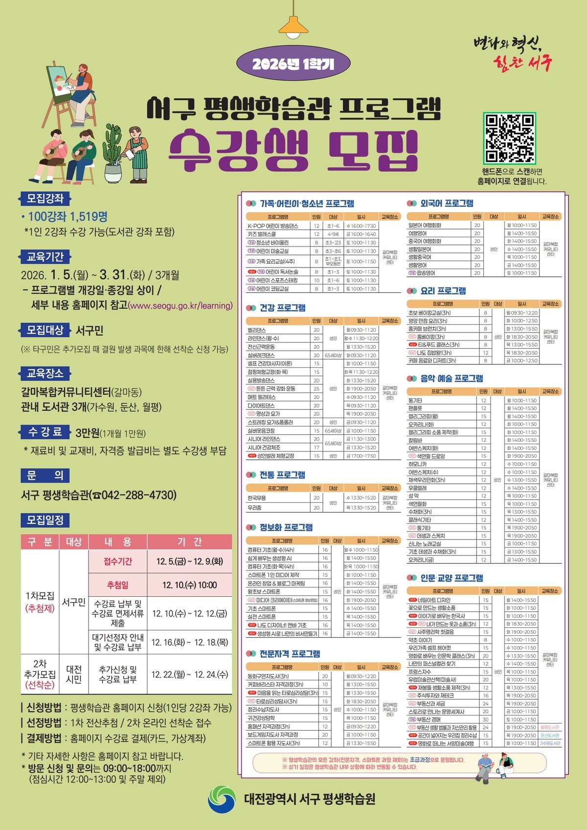 [세종타임즈] 대전 서구는 12월 5일부터 24일까지 2026년 1학기 평생학습관 프로그램 수강생을 모집한다.