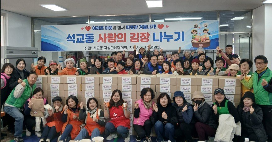 이날 행사에는 석교동 자생단체 회원 등 50 여 명이 참여해 겨울철 도움이 손길이 필요한 관내 소외계층 250 세대에 김장김치를 전달하며 훈훈한 이웃사랑을 실천했다.