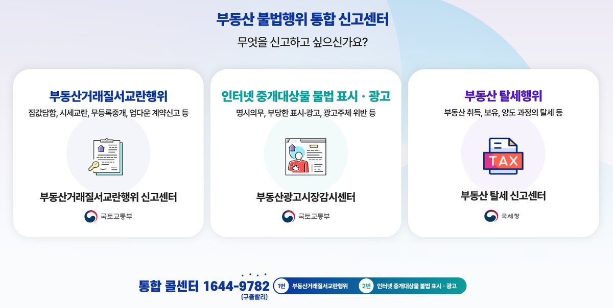 부동산 불법행위 신고는 ‘부동산 불법행위 통합 신고센터’를 통해 접수할 수 있으며, 최근에는 국세청의 ‘부동산 탈세 신고센터’도 통합 신고센터를 통해 접속이 가능하도록 개선하였다.