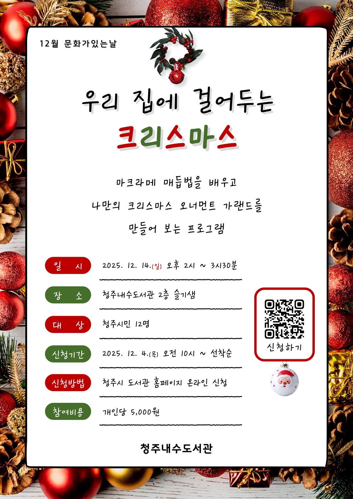 ‘우리 집에 걸어두는 크리스마스’라는 제목으로 진행되는 이번 프로그램은 오는 14일 오후 2시부터 3시 30분까지 2층 슬기샘에서 열린다.