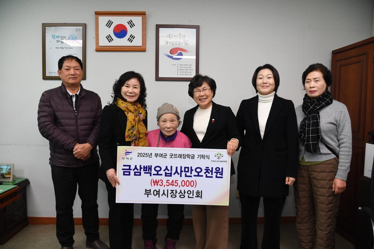 [세종타임즈] 부여시장상인회는 지난 2일 부여군청을 방문하여 인재 육성을 위한 장학금 354만 원을 부여군굿뜨래장학회에 기탁하였다.