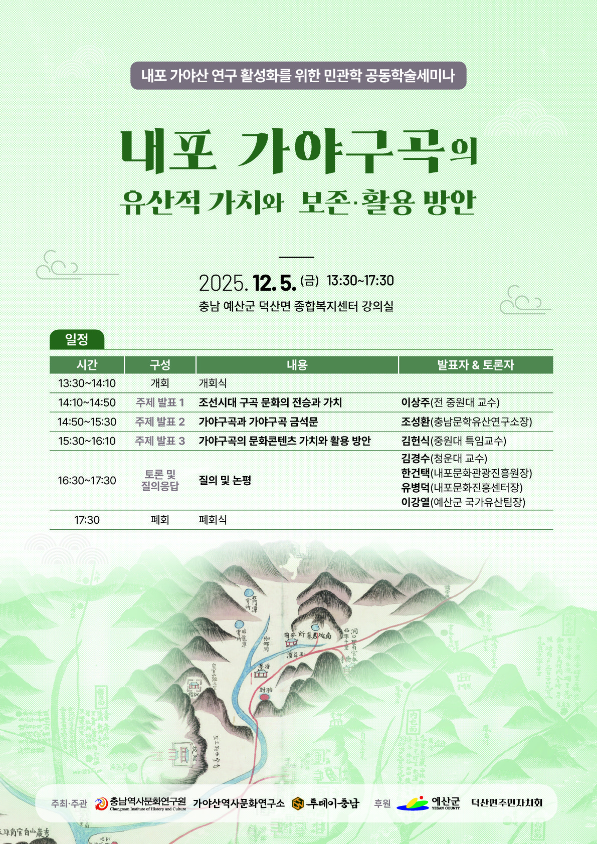 그리고 김경수 청운대학교 교수, 한건택 내포문화관광진흥원장, 유병덕 내포문화진흥센터장, 이강열 예산군 국가유산팀장 등 네 명의 전문적인 토론으로 가야산 가야구곡의 보존과 활용에 대한 논의와 방안을 제시할 예정이다.