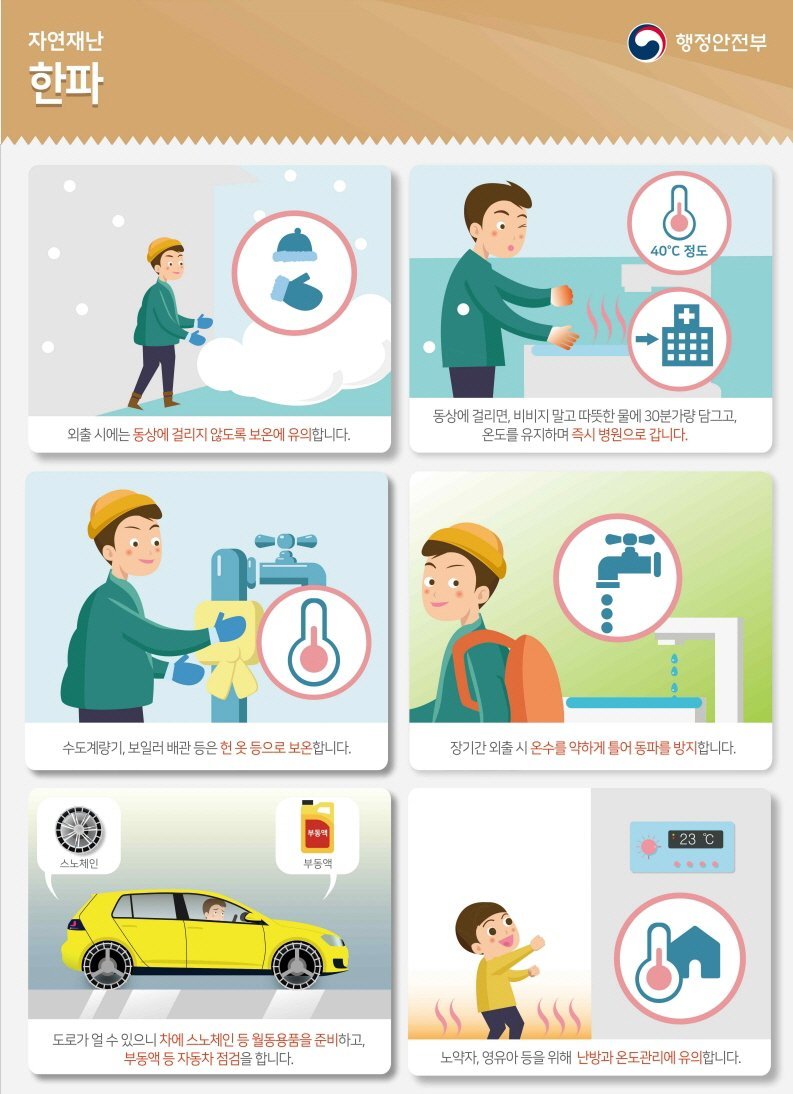 시는 한파 시 무리한 외출이나 장시간 야외 활동을 자제하고, 부득이하게 외출할 때에는 모자와 장갑, 방한화 등 보온 기능이 갖춰진 의복을 충분히 착용하여 체온 유지에 각별히 주의해야 한다고 강조했다.