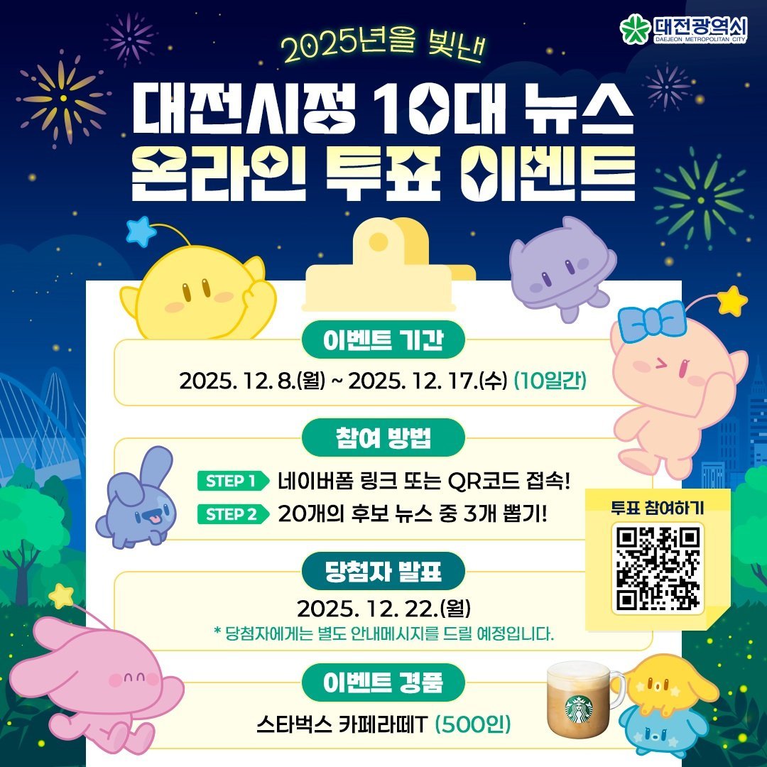 [세종타임즈] 대전시는 2025년 시정 성과 가운데 시민들의 공감을 얻은 뉴스를 선정하기 위해 8일부터 17일까지 ‘2025년을 빛낸 대전시정 10대 뉴스’투표를 진행한다.