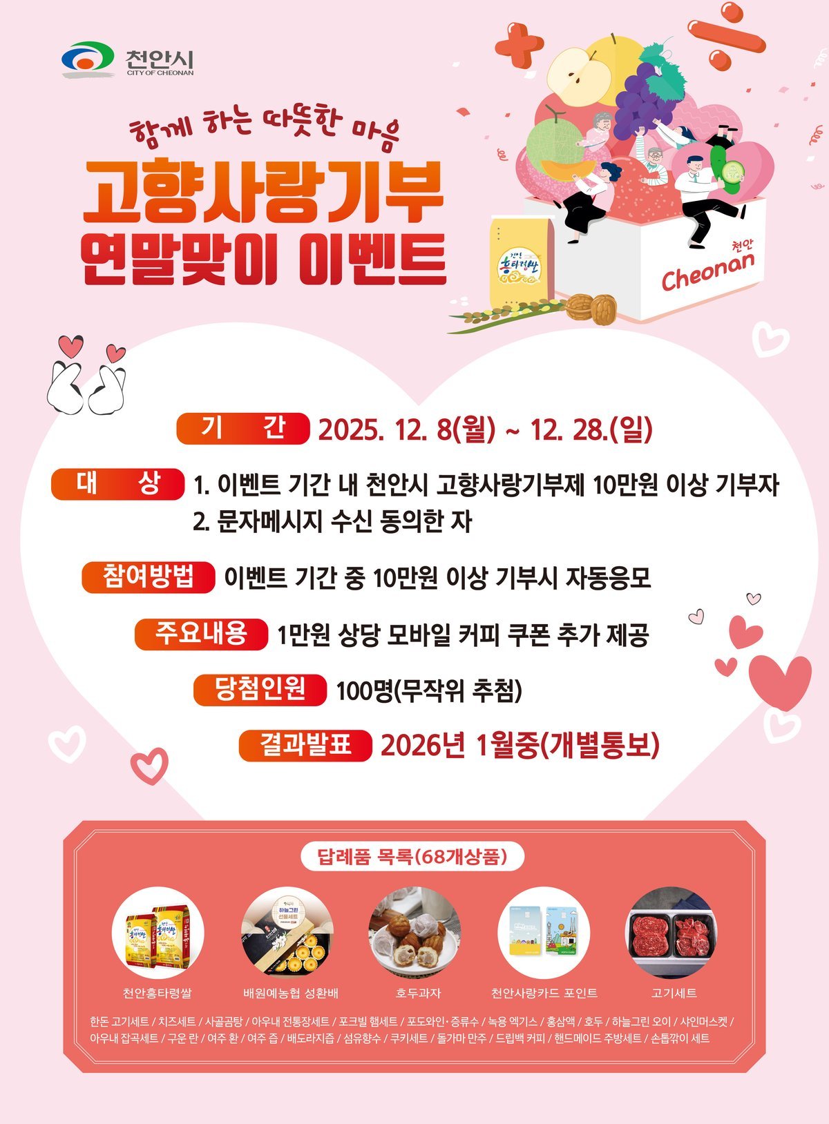이벤트 기간동안 고향사랑e음 누리집을 통해 천안시에 10만 원 이상 기부하고, 문자메시지 수신에 동의하면 자동 응모된다.