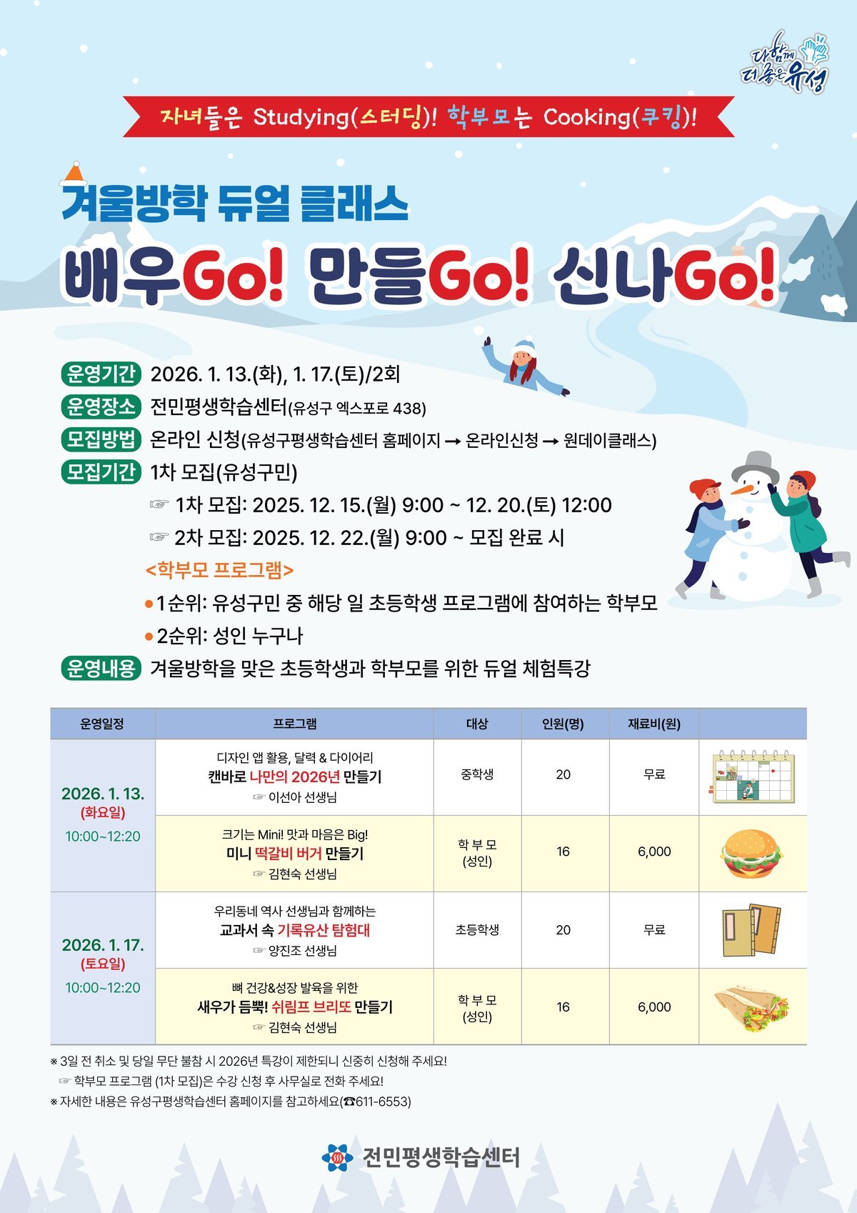 [세종타임즈] 대전 유성구는 전민평생학습센터에서 1월 13일과 17일 양일간 초·중학생과 학부모를 위한 체험형 프로그램 ‘듀얼 클래스, 배우GO! 만들GO! 신나GO!’를 운영한다.