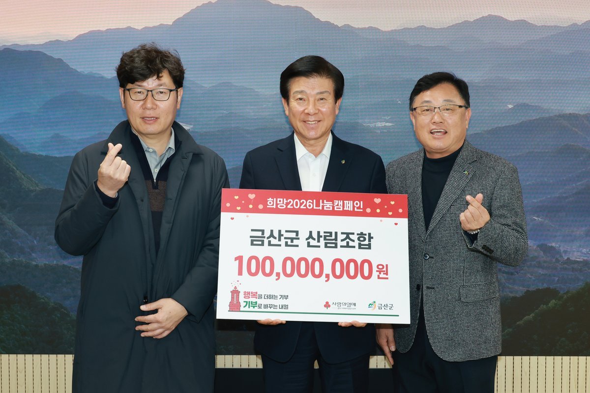 [세종타임즈] 금산군산림조합은 지난 9일 금산군청을 방문해 2026 희망나눔캠페인 성금 1억 원을 기탁하며 지역사회 나눔 실천에 앞장섰다.