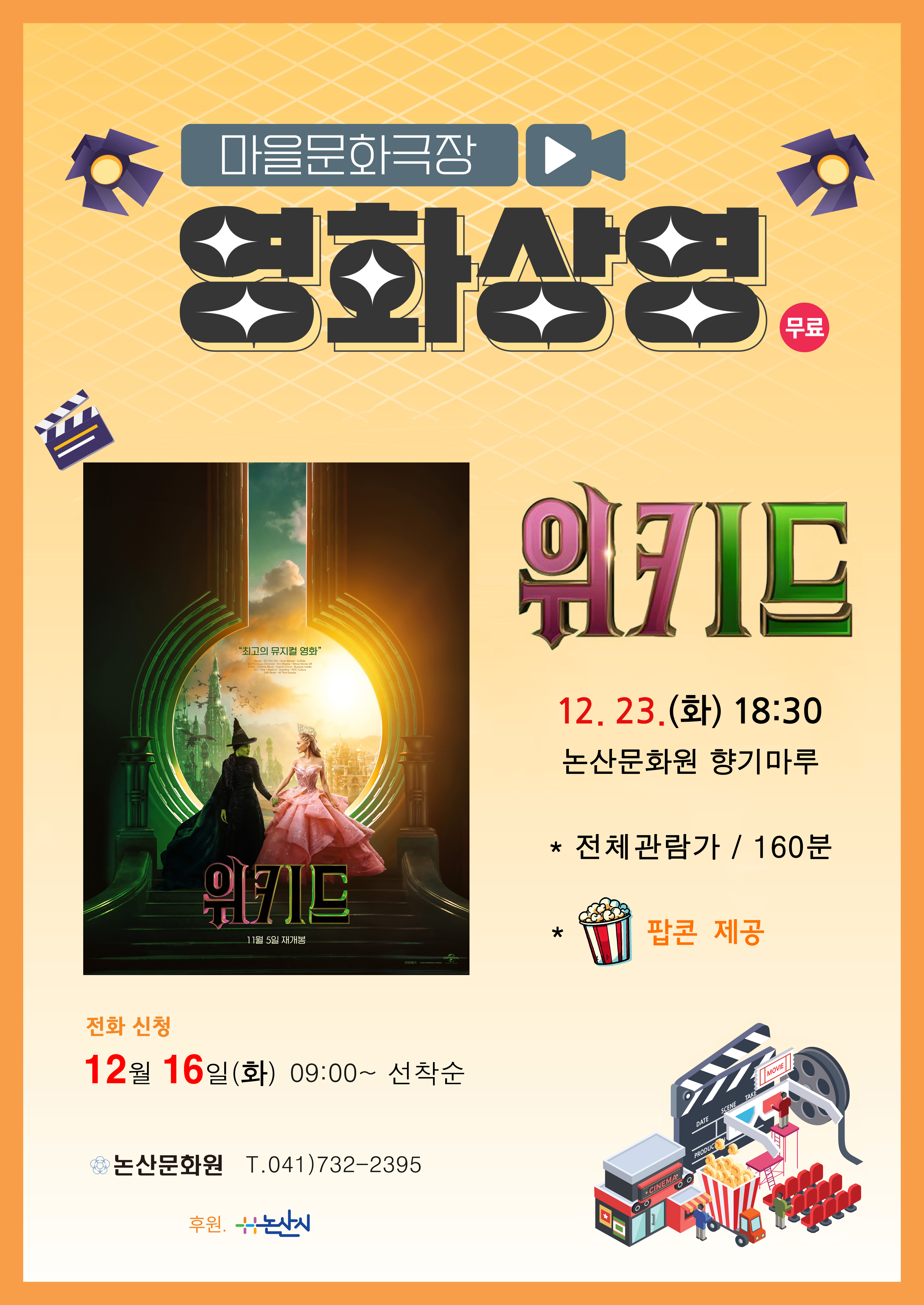 상영 작품은 지난 11월 재개봉한 판타지 영화 <위키드>로, 오는 12월 23일 오후 6시 30분, 논산문화원 향기마루에서 관람할 수 있다.