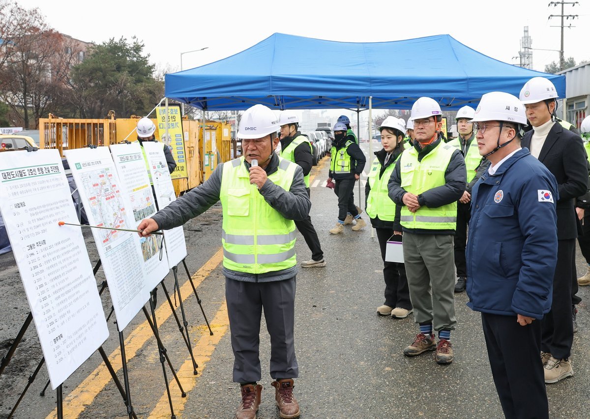 이장우 시장은 현장점검을 통해 △보행자 및 차량 통행 안전 여부 △동절기 현장근로자 방한대책 △교통처리상황예고 및 홍보 여부 등을 중점 확인했으며, 현장 관계자들에게 철저한 안전관리와 시공 품질 확보를 당부했다.