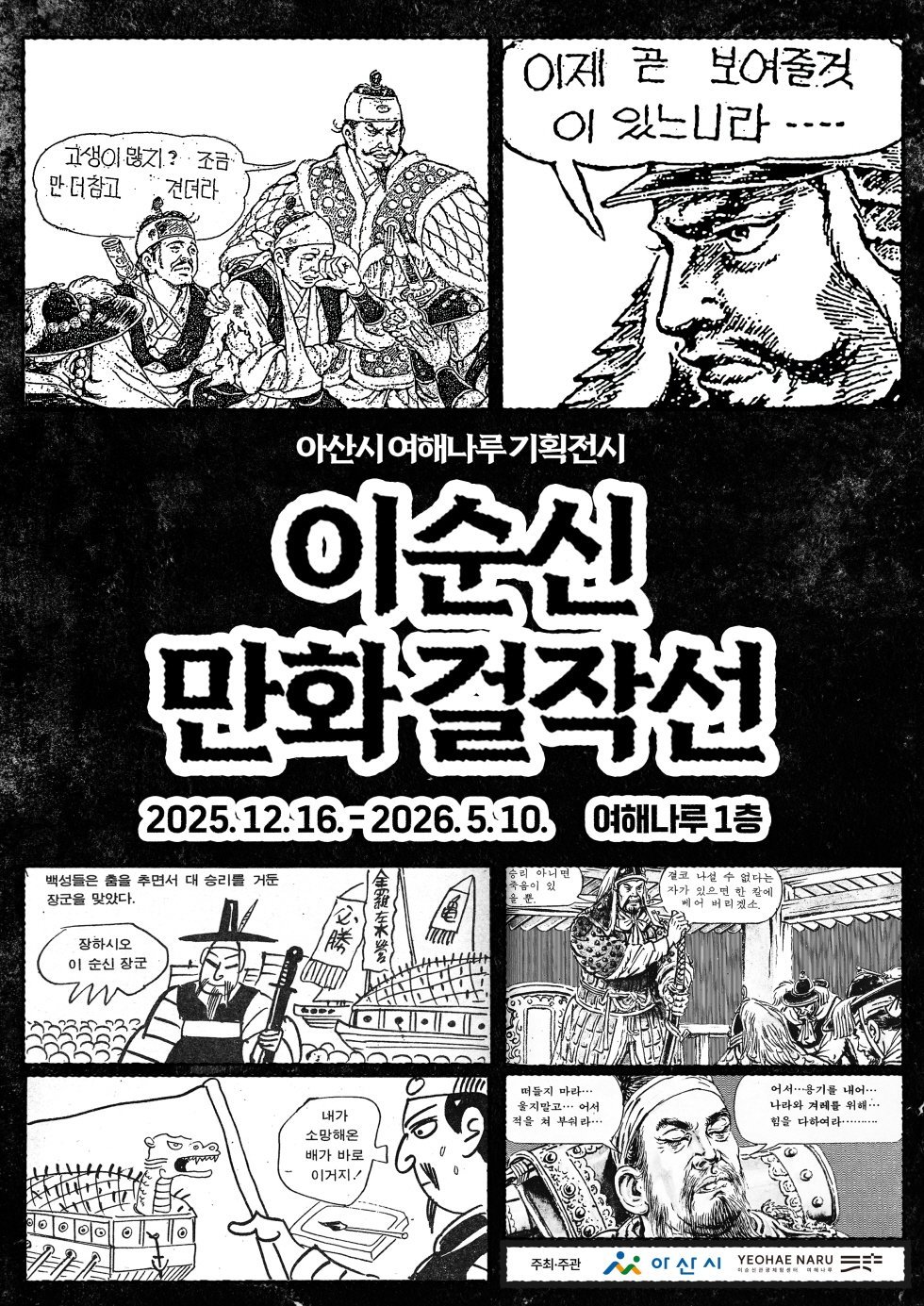 아산시 여해나루 ‘이순신만화걸작선’은 충무공 이순신 순국 제427주기를 기념하는 특별전으로 이번 달 16일부터 2026년 5월 10일까지 여해나루 1층 미디어아트홀에서 개최된다.