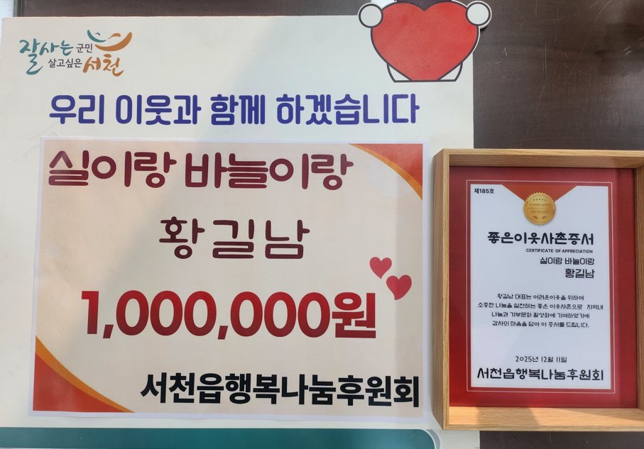 서천읍행복나눔후원회는 이날 황 대표를 ‘좋은이웃사촌’제185호로 선정하고 증서를 전달했으며 후원금은 연말연시 취약계층 지원 사업에 사용할 계획이다.